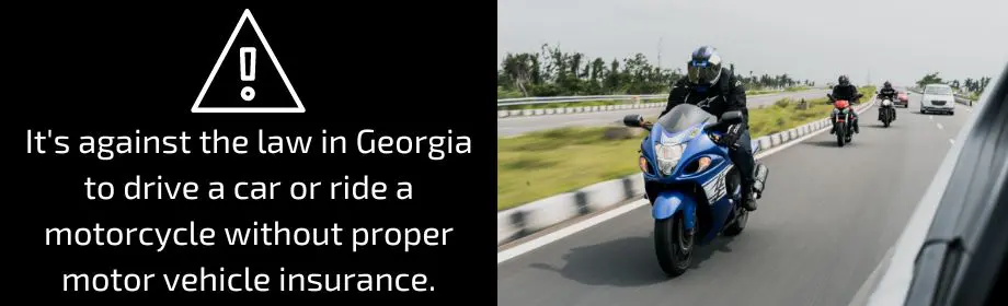 It’s against the law in Georgia to drive a car or ride a motorcycle without proper motor vehicle insurance. This insurance is in place to protect you and your interests in case of an accident so that you may recover financially if you’re wounded and so that you’re not ruined financially in case you have to pay for the medical expenses of an accident victim you’ve injured.